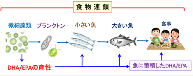 青魚やマグロやサバなど回遊しながら餌をとっている魚は、DHAやEPAが豊富ですが、これらの魚は体内でこれを生成しているのではないのです。これらの魚が餌として食べる微細藻類(びさいそうるい)、いわゆる植物プランクトンに含まれているのです。皆さんもクロレラ やユーグレナという言葉をよく聞くと思います。これ以外にたくさんの種類がありますが、これらが植物プランクトンと言われているもので、淡水にも海水や泥のなかにもいます。